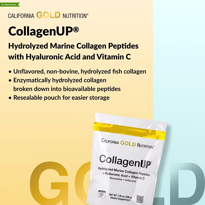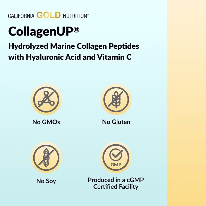 California Gold Nutrition CollagenUP features non-bovine, marine-sourced collagen peptides with hyaluronic acid and vitamin C. The specially processed fish collagen is enzymatically hydrolyzed (broken down) into low molecular weight component amino acid peptides in order to help ensure optimal absorption and bioavailability.*