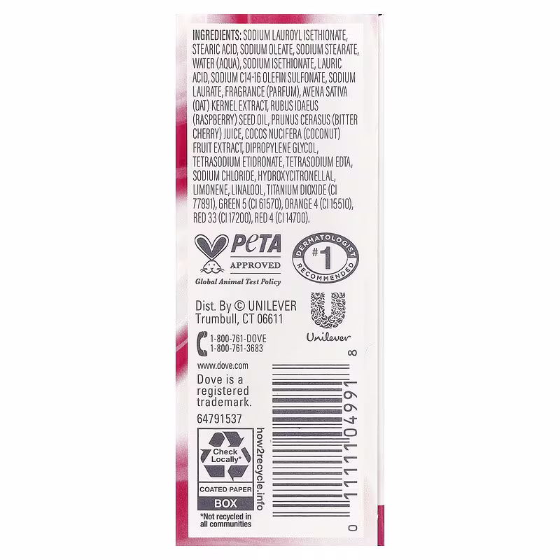 Sodium lauroyl isethionate, stearic acid, sodium oleate, sodium stearate, water (aqua), sodium isethionate, lauric acid, sodium c14-16 olefin sulfonate, sodium laurate, fragrance (parfum), avena sativa (oat) kernel extract, rubus idaeus (raspberry) seed oil, prunus cerasus (bitter cherry) juice, cocos nucifera (coconut) fruit extract, dipropylene glycol, tetrasodium etidronate, tetrasodium edta, sodium chloride, hydroxycitronellal, limonene, linalool, titanium dioxide (ci 77891), green 5 (ci 61570), orange 4 (ci 15510), red 33 (ci 17200), red 4 (ci 14700).